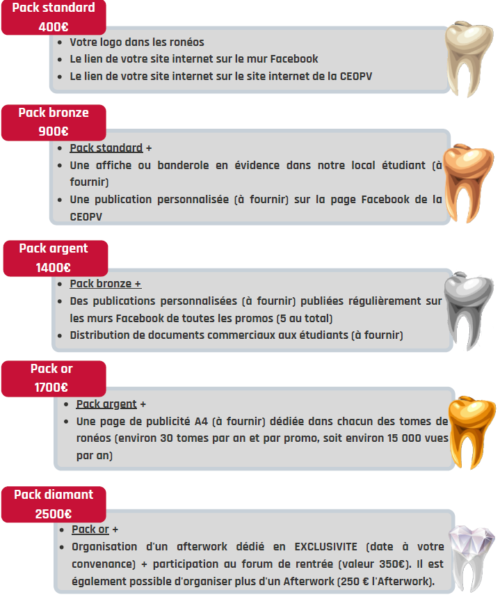 Les formules proposées le sont à TITRE INDICATIF, nous sommes à votre écoute pour toutes suggestions ou demandes spécifiques par mail à l'adresse ceopv.partenariat@gmail.com.